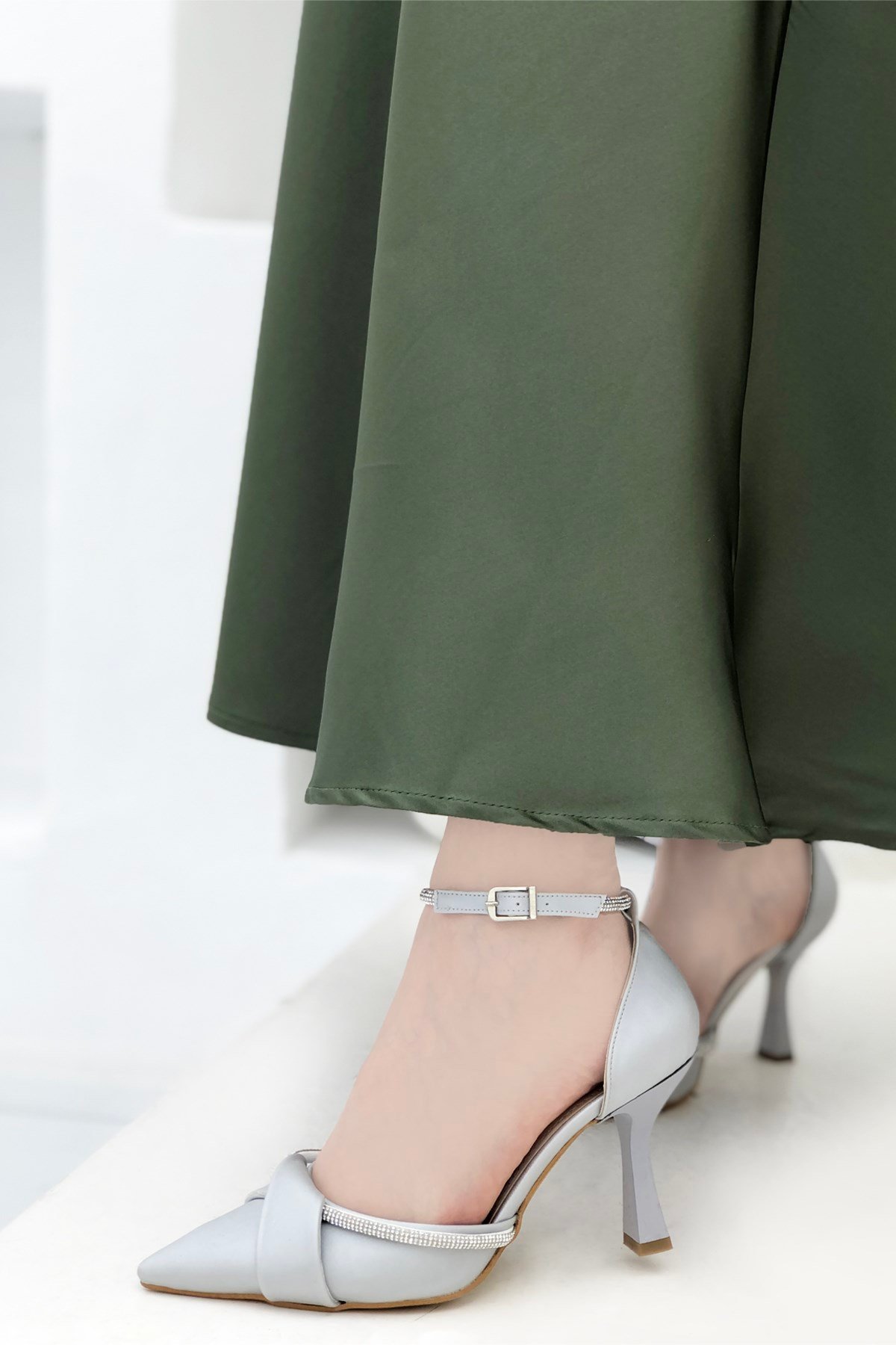 Bilek Bantlı Taşlı Kadın Stiletto Gümüş Saten SÇ-04